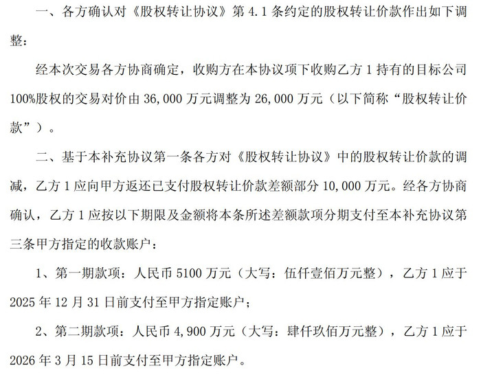 交易对价调减1亿元,卖方分两期返还